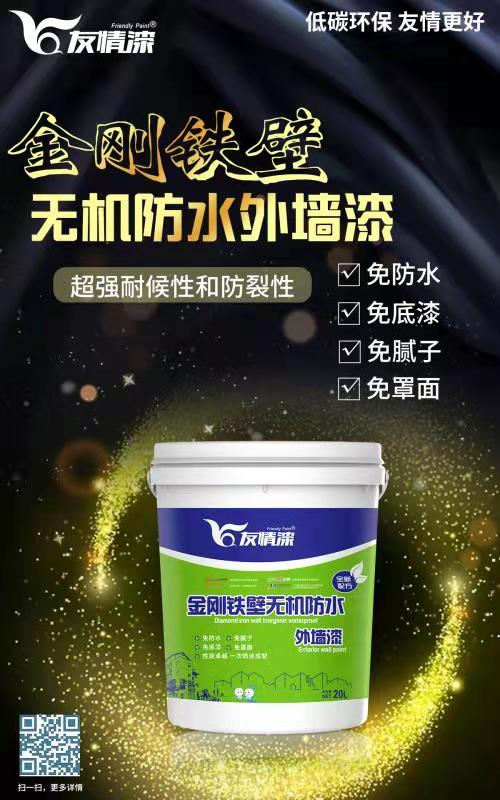 友情金剛鐵壁外墻漆是集防水和抗堿于一體的革命性外墻漆,可以避免外墻施工中,由于膩子和抗堿底漆的產品質量和施工不當引起的漆膜剝落、泛堿、開裂等問題。還能幫助工程商省去多余的人工和材料成本。